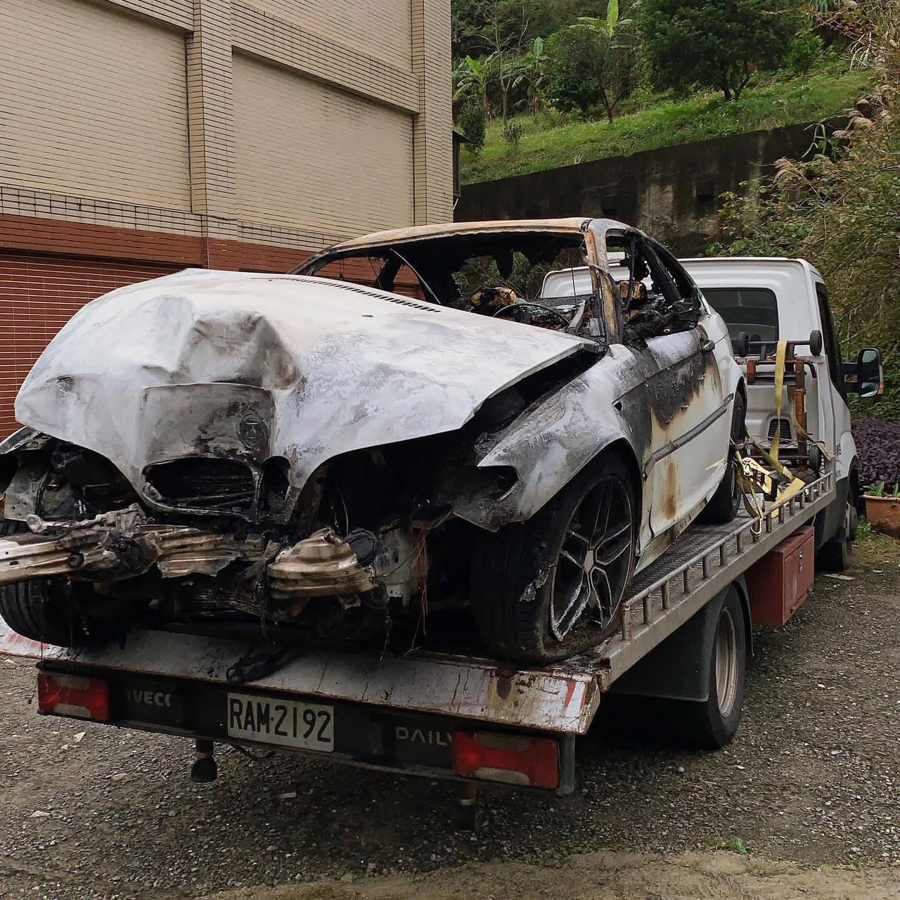 從照片中可見,車頭潰縮、引擎室受損,這類狀況若強行發動或推行,可能造成更嚴重的機械損壞,甚至引發漏油、起火等危險。